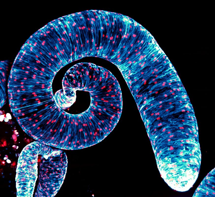 Maik Bischoff’s honorable mention in Nikon’s 2025 Small World in Motion Competition. Bischoff’s microscopic photograph displays the developing testis of a fruit fly, showing actin cytoskeleton (teal) and nuclei (red). (Courtesy of Nikon Small World.)