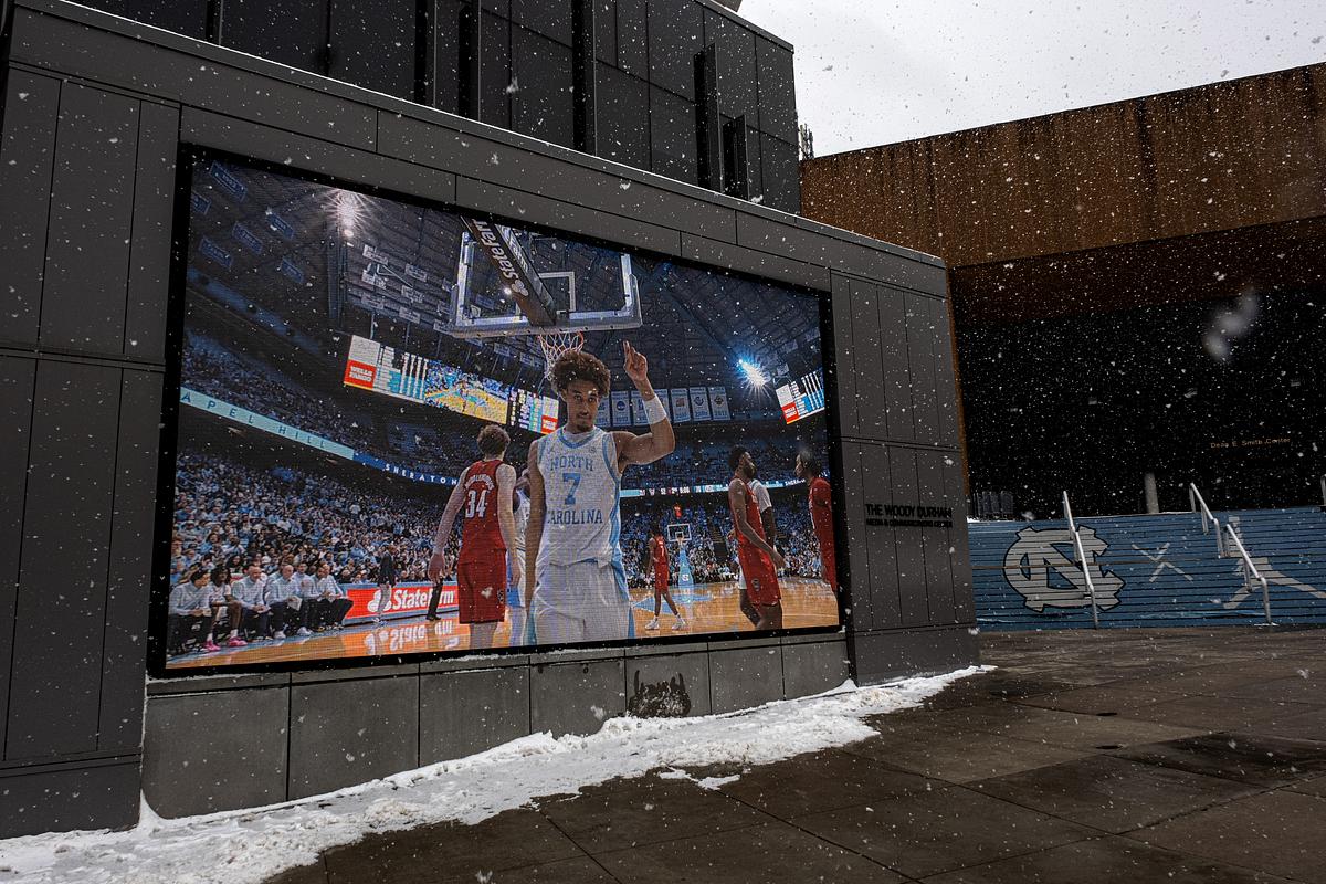 Snow falls outside the Dean E. Smith Center in February 2025, as highlights from the previous night’s mens basketball game play on the large screen outside the Woody Durham Media and Communications Center. (Jon Gardiner/UNC-Chapel Hill)