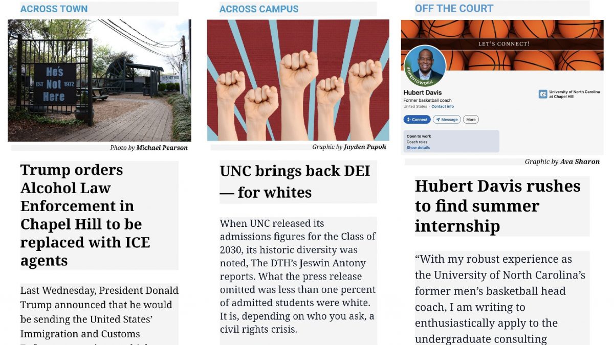 At least three student editors at the DTH have resigned because of the April 1 edition and a related email blast. The publications were filled with satirical articles. One claimed that ICE agents were about to come to Chapel Hill. Another article said, “Hubert Davis rushes to find summer internship.” A third headline read, “UNC brings back DEI policies — for whites.”